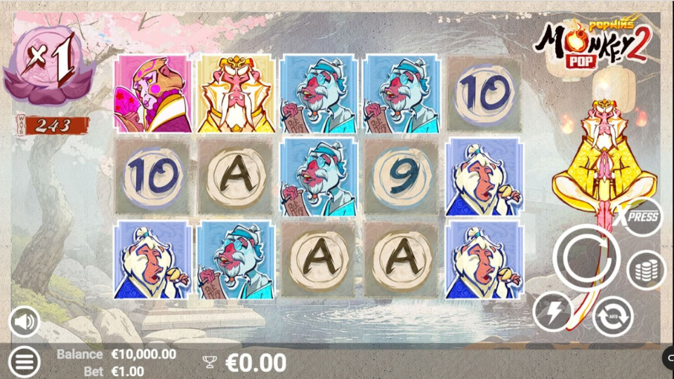 Monkey Pop 2 operates on a 5-reel, 3-row grid with 243 fixed ways to win, paying from left to right only. The PopWins mechanic removes winning symbols, adds new symbols, and expands the grid by one row per reel after each win.