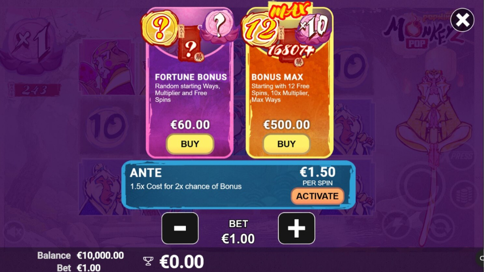 Spinning the reels in Monkey Pop 2 is straightforward, with several options that affect how the game plays: