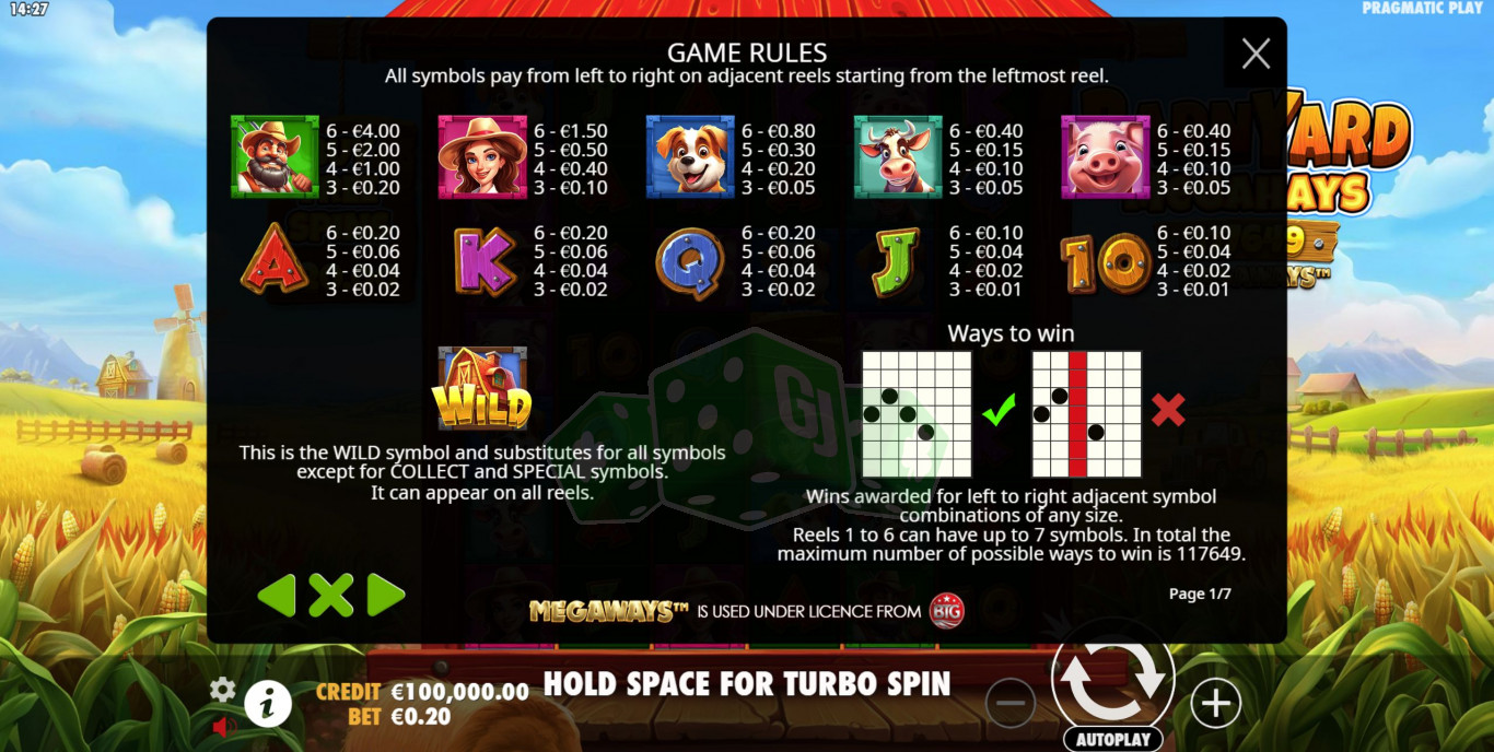 Barnyard Megahays Megaways slot uses the Megaways mechanic. Owing to this mechanic, several ways to win appear on each spin. The higher the number of symbols populating the reels, the higher the number of active megaways. The maximum number of megaways stands at 117,649 megaways.