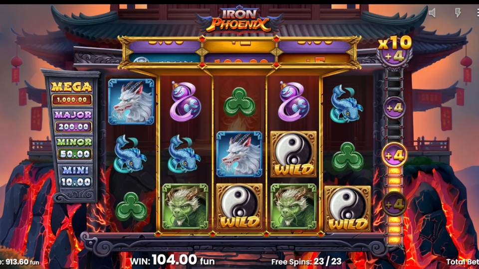 - Free Spins Feature: Triggered by 3+ scatters (via base game or Phoenix Reel), awarding 10 to 20 spins. During this round, the single Phoenix Reel becomes three – one per middle reel. Each Phoenix symbol collected fills a progression bar; every 4 collected offers +4 extra spins and reaching level 4 grants a 10x multiplier on Phoenix Reel payouts and jackpots.