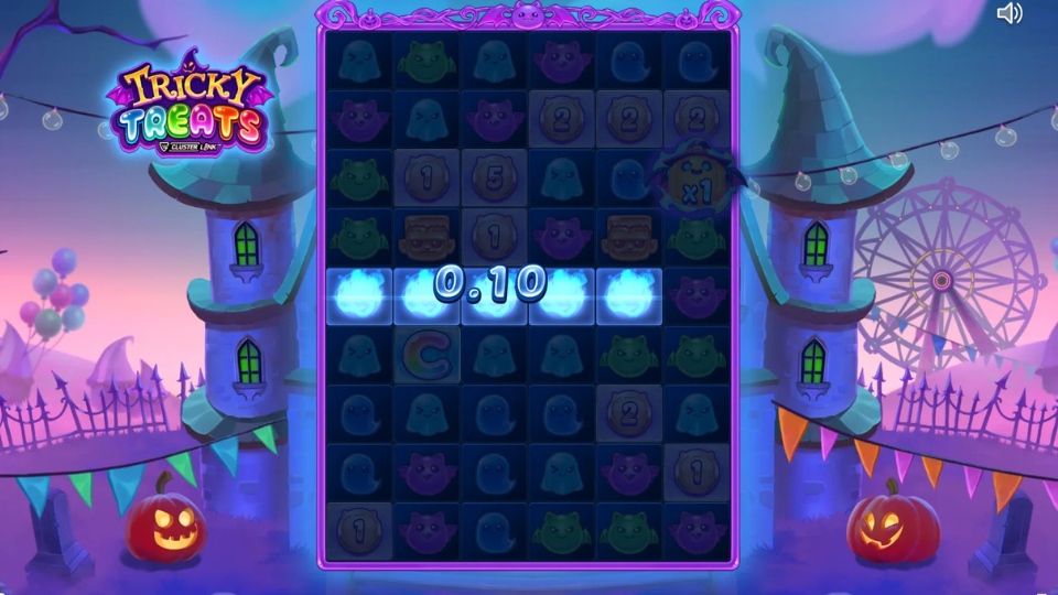 The Tricky Treats slot uses a 6 x 9 grid and operates on a cluster pays mechanic: wins are achieved by forming clusters of 5 or more matching symbols that connect horizontally or vertically. The standard RTP is 96.32% (with alternate versions such as 94.38% depending on the operator). Volatility is rated as high. The maximum payout is up to 10,000x your bet.