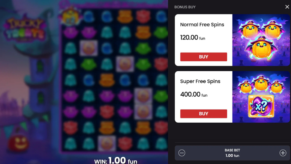 Feature Buy / Push Bet Options: For jurisdictions where available, players can use the Push Bet option to gain access to the incorporated bonus features. Paying an increased bet to guarantee 1 or 2 Pumpkin Wilds per spin or directly use Bonus Buy: for example, 120x bet for direct Free Spins mode or 400x bet for “Super Free Spins” with extra Wild Multiplier guarantee.