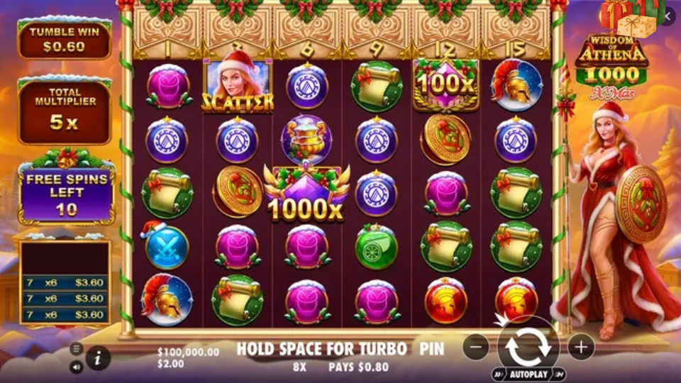Wisdom of Athena 1000 Xmas is a festive holiday edition of Pragmatic Play’s popular high-volatility slot. The game applies a Christmas theme to the familiar Acropolis setting, with snow-covered visuals, festive symbols, and Athena wearing a Santa hat.